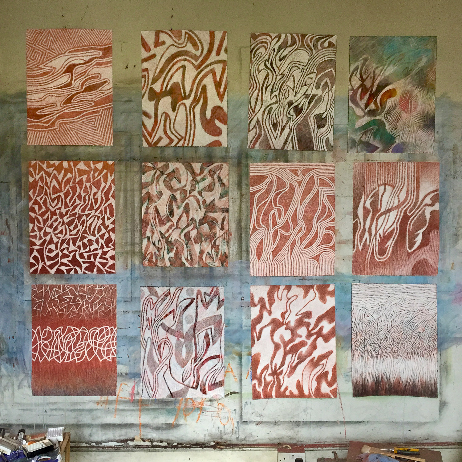 late pastel drawings on the studio wall